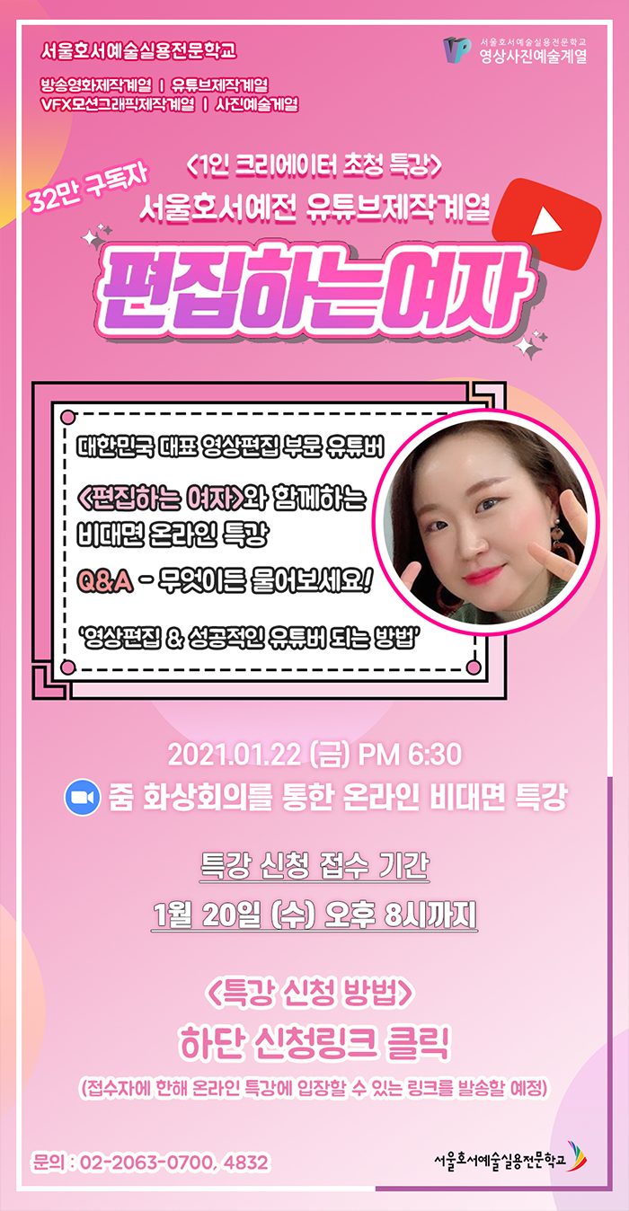 32만 구독자가 인정한 대한민국 대표 영상편집 부문 유튜버 <편집하는 여자>와 함께하는 비대면 온라인 특강을 진행합니다.