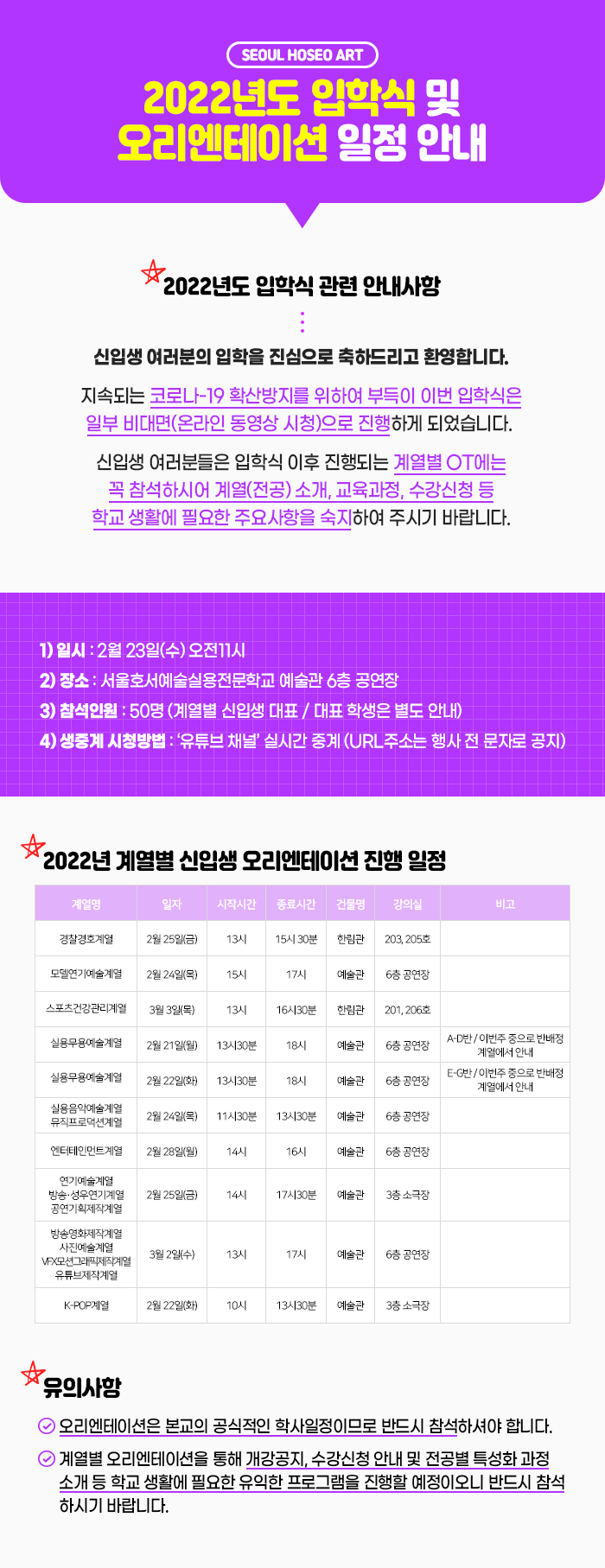 서울호서예술실용전문학교 2022학년도 입학식 및 오리엔테이션 일정 안내