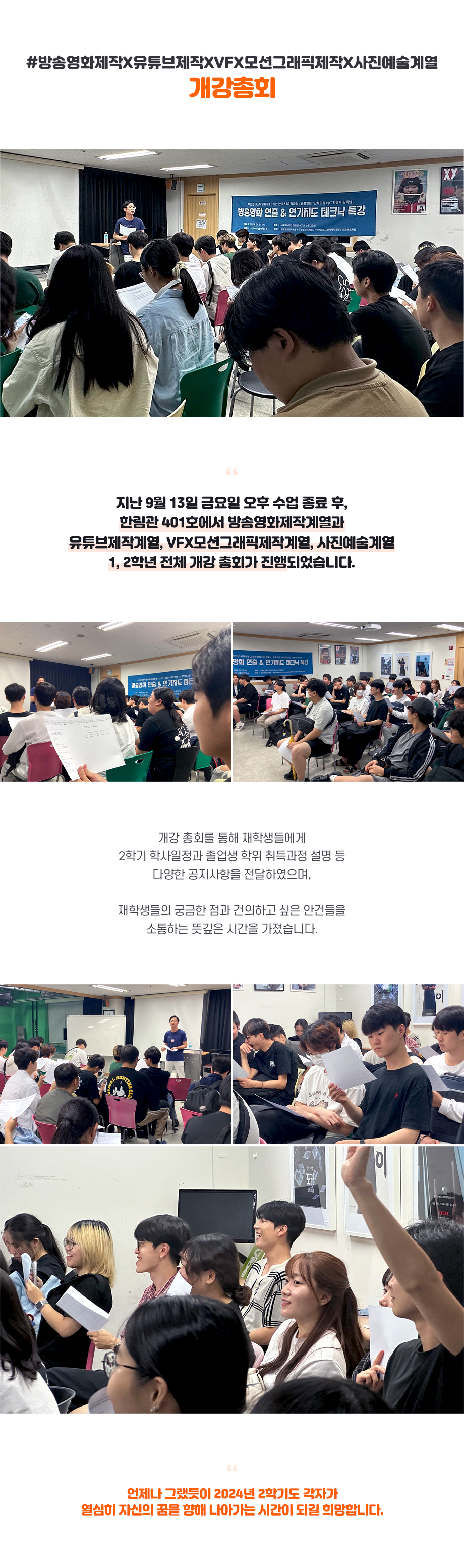 지난 9월 13일, 오후 수업 종료 후 한림관 401호에서 방송영화제작계열과 유튜브제작계열, VFX모션그래픽제작계열, 사진예술계열 1, 2학년 전체 개강 총회가 진행되었습니다. 개강 총회를 통해 재학생들에게 2학기 학사일정과 졸업생 학위 취득과정 설명 등 다양한 공지사항을 전달하였으며, 재학생들의 궁금한 점과 건의하고 싶은 안건들을 소통하는 뜻깊은 시간을 가졌습니다.