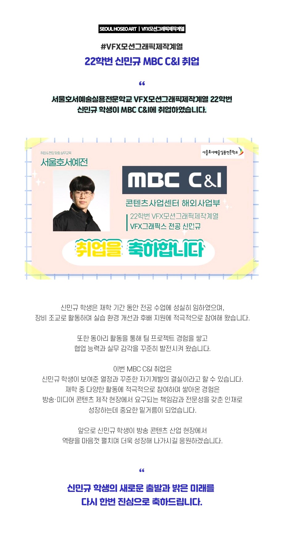 서울호서예술실용전문학교 VFX모션그래픽제작계열 22학번 신민규 학생이 MBC C&I에 취업하였습니다.