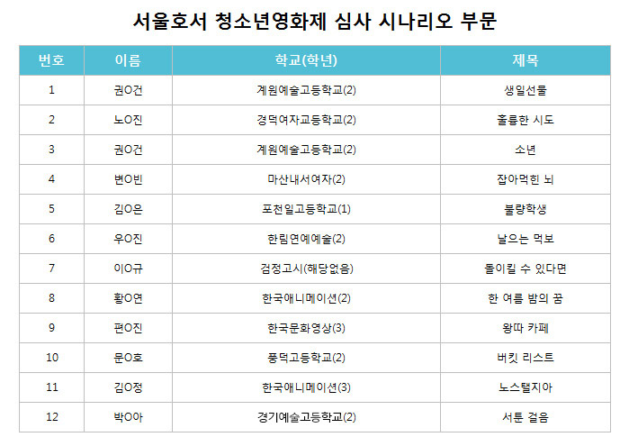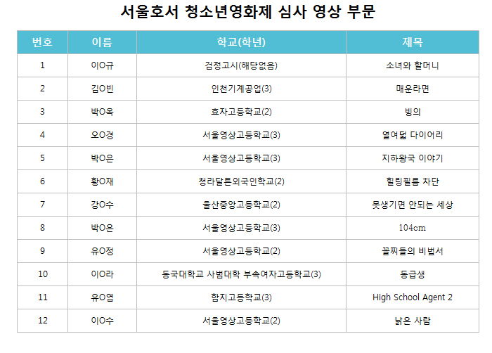 앞으로도 좋은 작품을 계속해서 만들어 주시고 서울호서청소년영화제에 관심을 가져 주시길 부탁드립니다.