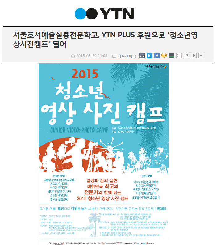 서울호서예술실용전문학교가 YTN PLUS와 서울필름스쿨 후원으로 '2015 청소년영상캠프'를 연다.
