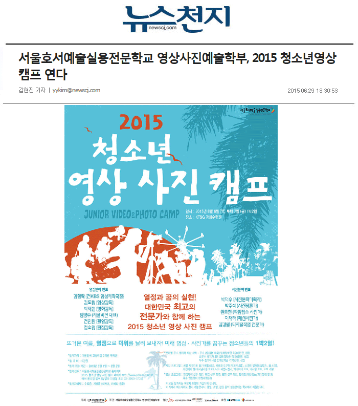 [뉴스천지]영상사진예술학부, 2015 청소년영상캠프 연다
