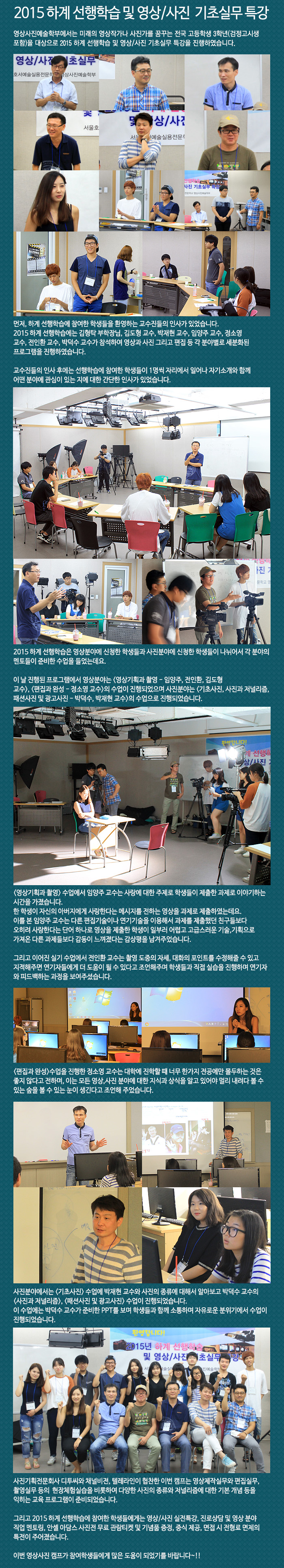 영상사진예술학부에서는 미래의 영상작가나 사진가를 꿈꾸는 전국 고등학생 3학년(검정고시생 포함)을 대상으로 2015 하계 선행학습 및 영상 사진 기초실무특강을 진행하였습니다.