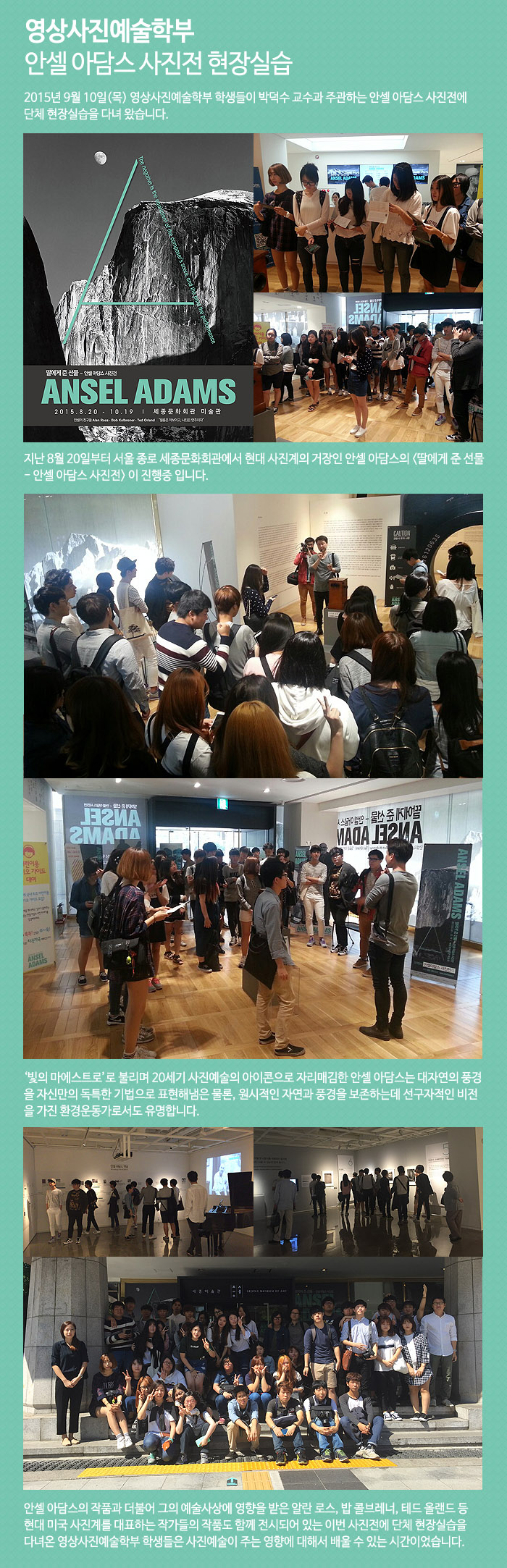 2015년 9월 10일(목) 영상사진예술학부 학생들이 박덕수 교수과 주관하는 안셀 아담스 사진전에 단체 현장실습을 다녀 왔습니다.