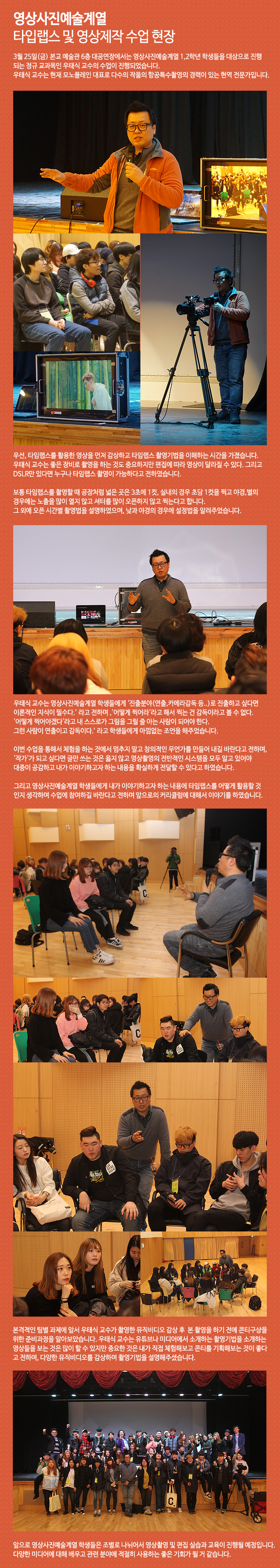 3월 25일(금) 본교 예술관 6층 대공연장에서는 영상사진예술계열 1,2학년 학생들을 대상으로 진행되는 정규 교과목인 우태식 교수의 수업이 진행되었습니다.