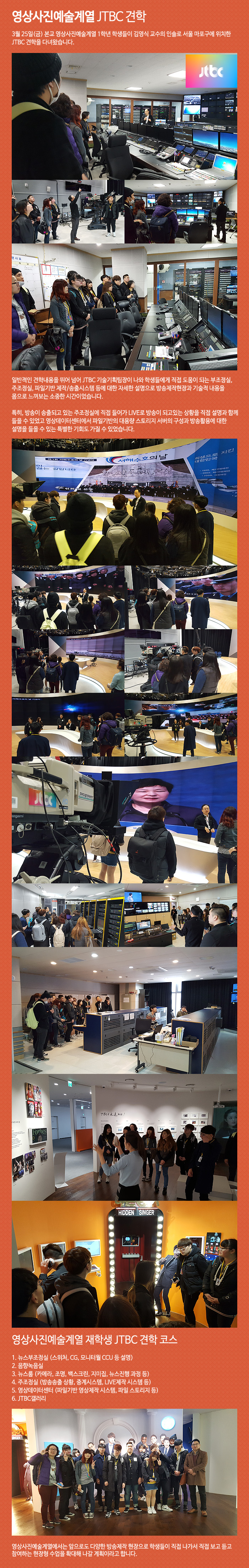 3월 25일(금) 본교 영상사진예술계열 1학년 학생들이 김영식 교수의 인솔로 서울 마포구에 위치한 JTBC 견학을 다녀왔습니다.
