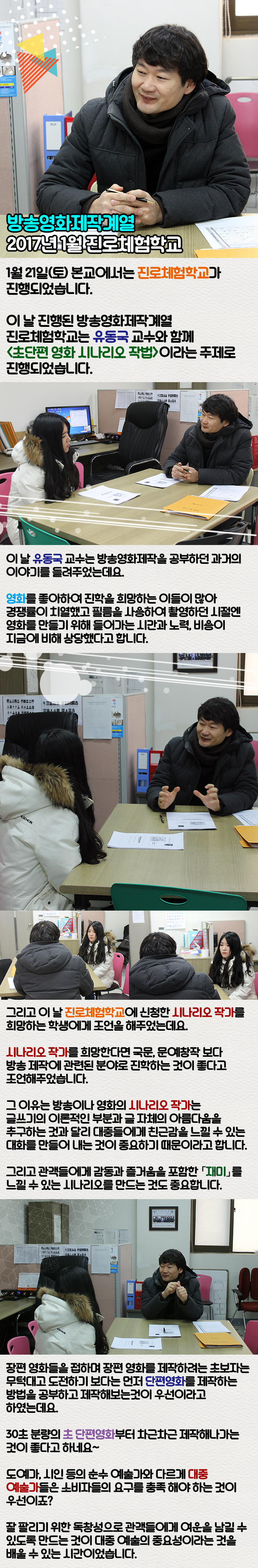 이 날 진행된 방송영화제작계열 진로체험학교는 유동국 교수와 함께 <초단편 영화 시나리오 작법>이라는 주제로 진행되었습니다.
