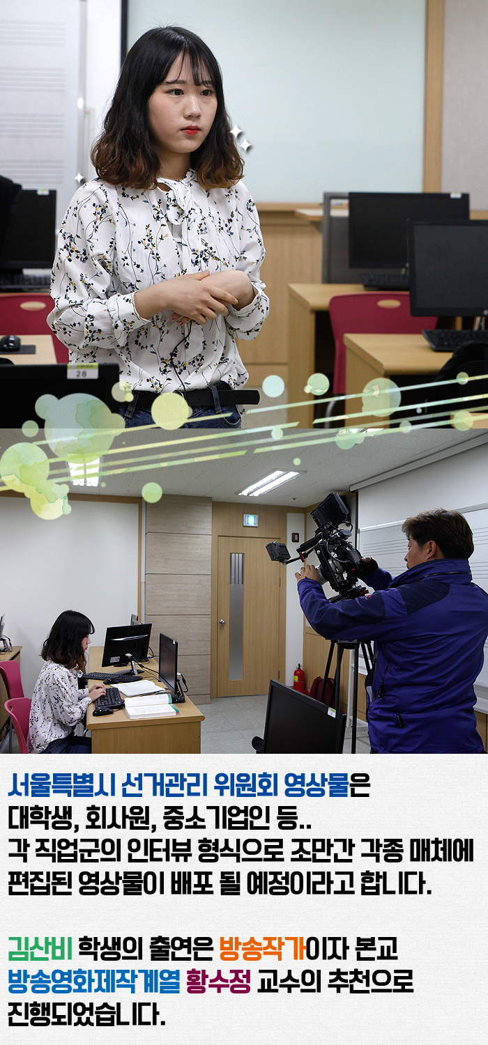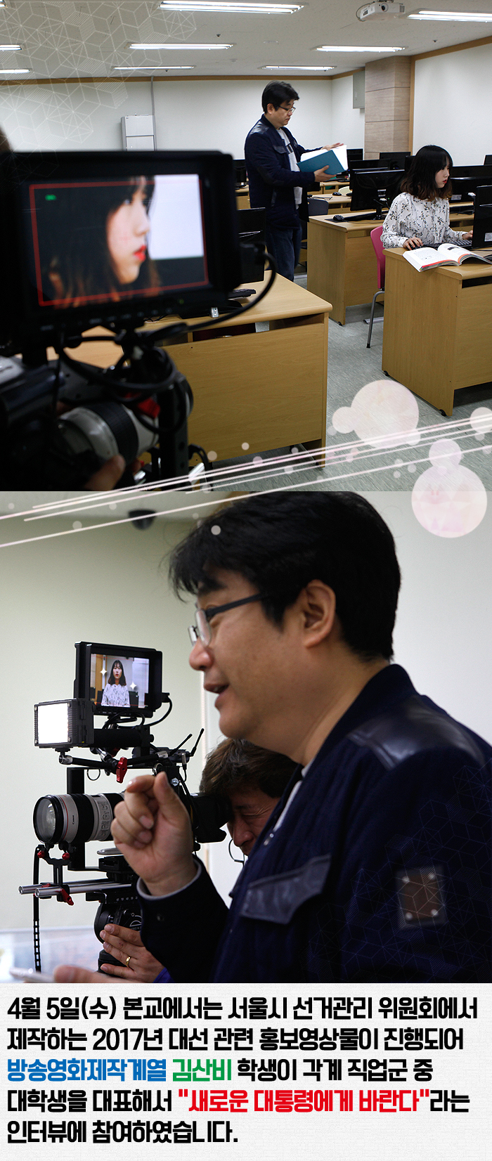 4월 5일(수) 본교에서는 서울시 선거관리 위원회에서 제작하는 2017년 대선 관련 홍보영상물이 진행되어 방송영화제작계열 김산비 학생이 각계 직업군 중 대학생을 대표해서 "새로운 대통령에게 바란다"라는 인터뷰에 출연했습니다.