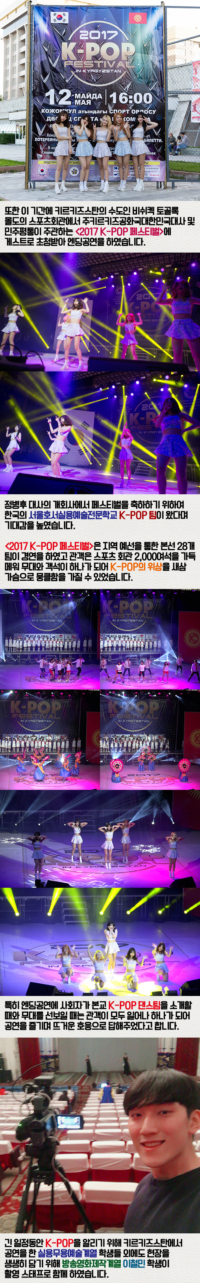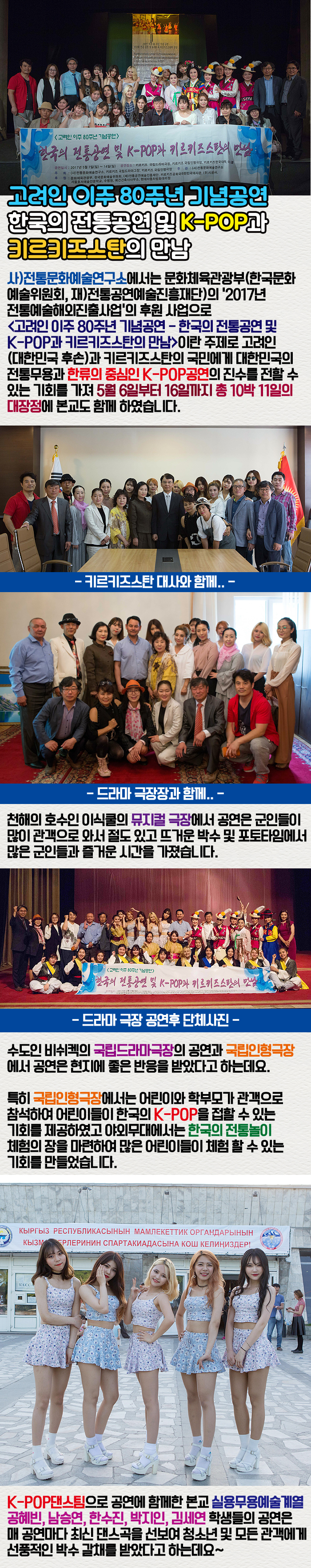 사)전통문화예술연구소에서는 문화체육관광부(한국문화예술위원회, 재)전통공연예술진흥재단)의 ‘2017년 전통예술해외진출사업’의 후원 사업으로 '고려인 이주 80주년 기념공연 - 한국의 전통공연및 K-POP과 키르키즈스탄의 만남'이란 주제로 고려인(대한민국 후손)과 키르키즈스탄의 국민에게 대한민국의 전통무용과 한류의 중심인K-POP공연의 진수를 전할 수 있는 기회를 가져 5월 6일부터 16일까지 총 10박 11일의 대장정에 본교도 함께 하였습니다.