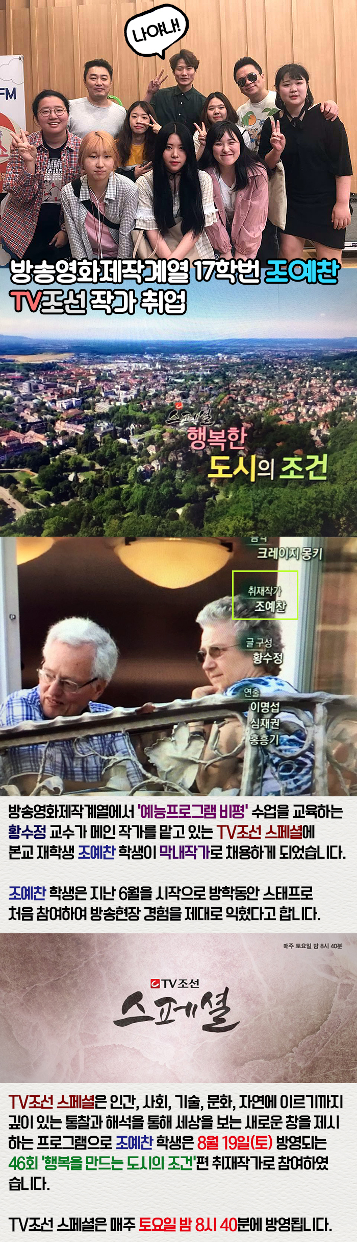17학번 조예찬 학생이 TV조선 스페셜 막내작가로 취업하여 참여한 다큐멘터리가 방영 예정입니다.