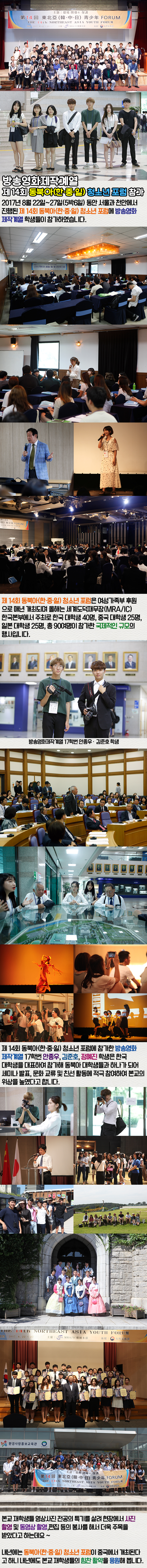 2017년 8월 22일~27일(5박6일) 동안 서울과 천안에서 진행된 제 14회 동북아(한·중·일) 청소년 포럼에 방송영화제작계열 학생들이 한국 대학생 대표로 참가하였습니다.