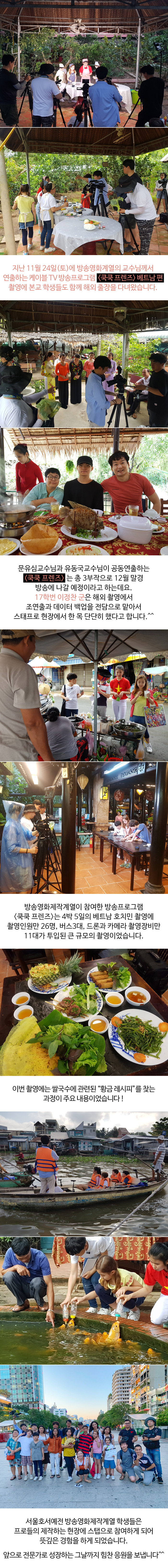 지난 11월 24일(토)에 방송영화계열의 교수님께서 연출하는 케이블 TV 방송프로그램 <쿡쿡 프렌즈> 베트남 편 촬영에 본교 학생들도 함께 해외 출장을 다녀왔습니다.