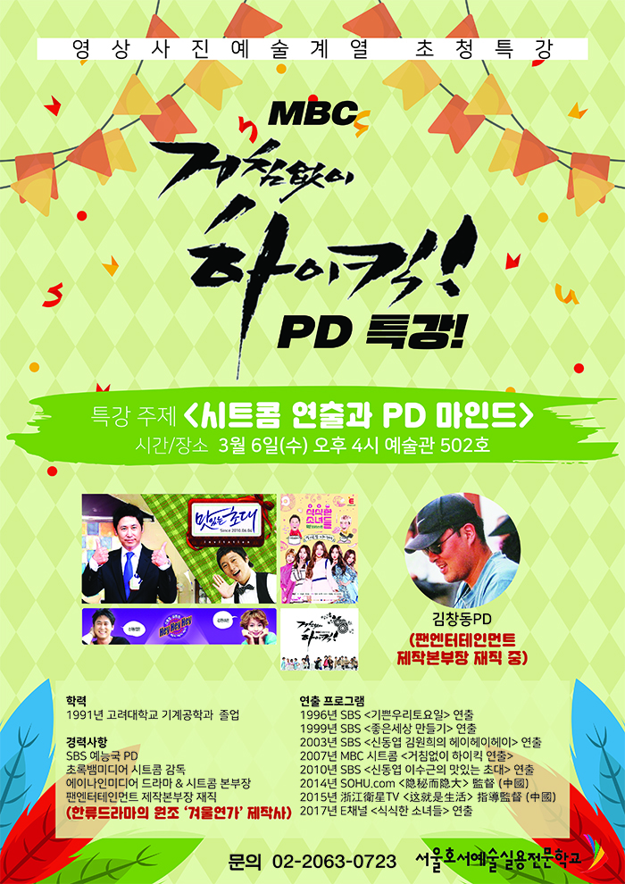 2019 1학기 3월 6일(수) 오후 4시 예술관 502호에서 MBC <거침없이 하이킥>을 연출하고 현재 드라마<겨울연가>를 만든 한류열풍의 원조 팬엔터테인먼트에서 제작본부장으로 재직 중이신 김창동 PD님의 초청 특강이 아래와 같이 예정되어 있습니다.