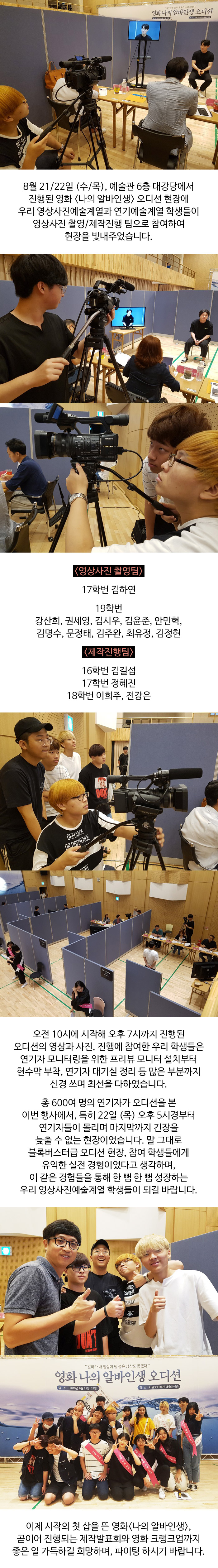 8월 21/22일 (수/목), 예술관 6층 대강당에서 진행된 영화 <나의 알바인생> 오디션 현장에 우리 영상사진예술계열과 연기예술계열 학생들이 영상사진 촬영/제작진행 팀으로 참여하여 현장을 빛내주었습니다.