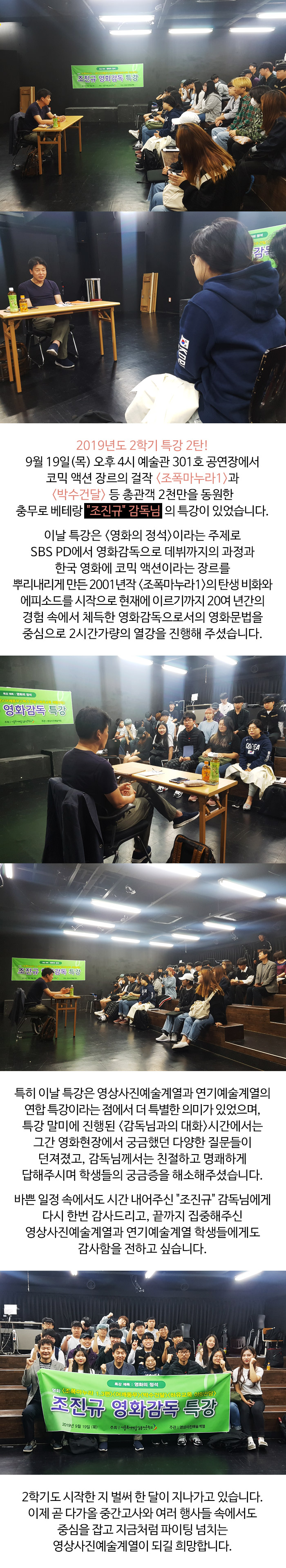 9월 19일 (목) 오후 4시부터, 예술관 301호 공연장에서 코믹 액션 장르의 걸작 <조폭마누라1>과 <박수건달> 등 총관객 2천만을 동원하신 충무로 베테랑 "조진규" 감독님의 특강이 있었습니다.