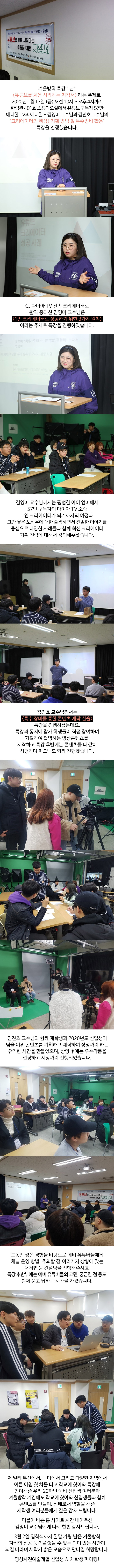 겨울방학 특강 1탄! '유튜브를 처음 시작하는 지침서' 라는 주제로 2020년 1월 17일 (금) 오전 10시 ~ 오후 4시까지 한림관 401호 스튜디오실에서 유튜브 구독자 57만 애니한 TV의 애니한 - 김영미 교수님과 김진호 교수님의 "크리에이터의 핵심! 기획 방법 & 특수장비 활용" 특강을 진행했습니다.