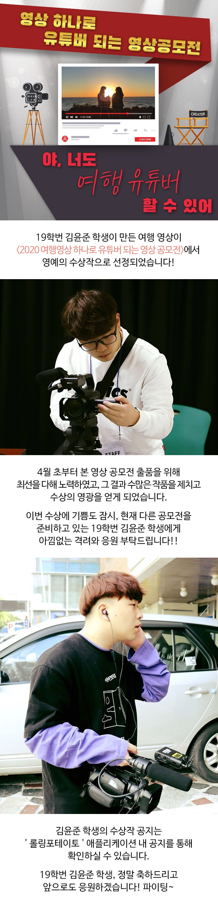 방송영화제작계열 19학번 김윤준 학생 '2020 여행영상 하나로 유튜버 되는 영상 공모전' 입상