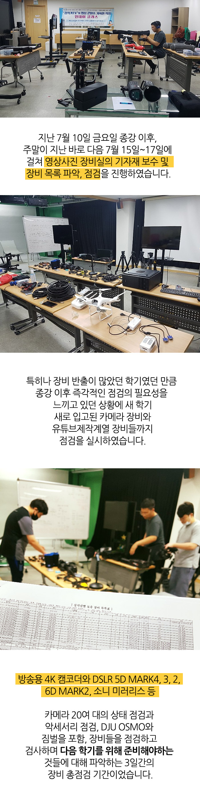 영상사진유튜브제작계열 장비실의 기자재 보수 및 장비 목록 파악, 점검을 진행하였습니다.