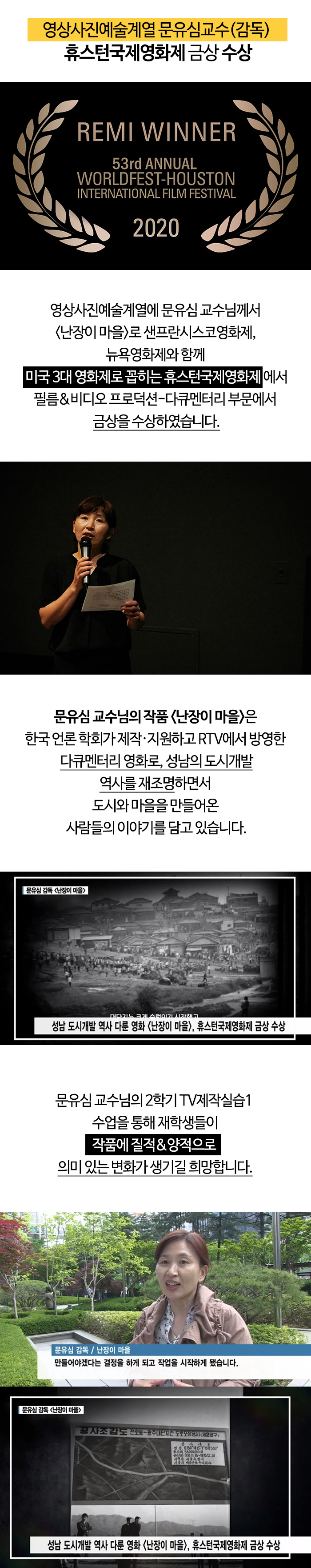 영상사진예술계열에 문유심 교수님께서 휴스턴국제영화제에서 금상을 수상하였습니다.