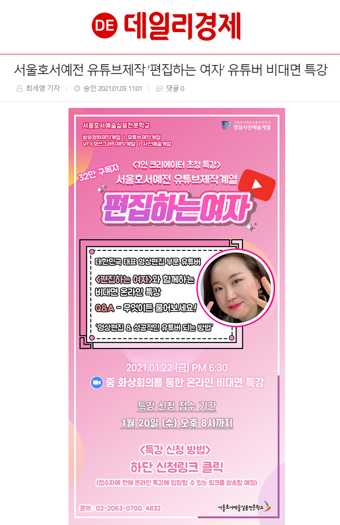 [언론보도]서울호서예전 유튜브제작, ‘편집하는 여자’ 유튜버 비대면 특강