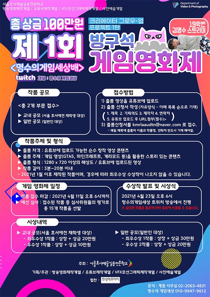 성장하려는 크리에이터를 지원하고 뒷받침해 주는 서울호서예전의 "크리에이터 그로우 업" 프로젝트 제1탄 총상금 100만원! 제1회 명수의 게임세상배 - 방구석 게임영화제가 아래와 같이 개최됩니다.