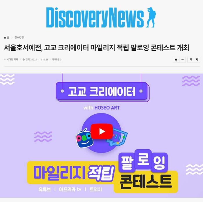 서울호서예술실용전문학교는 고교 크리에이터를 위한 마일리지 적립 팔로잉 콘테스트를 개최한다고 10일 밝혔다.