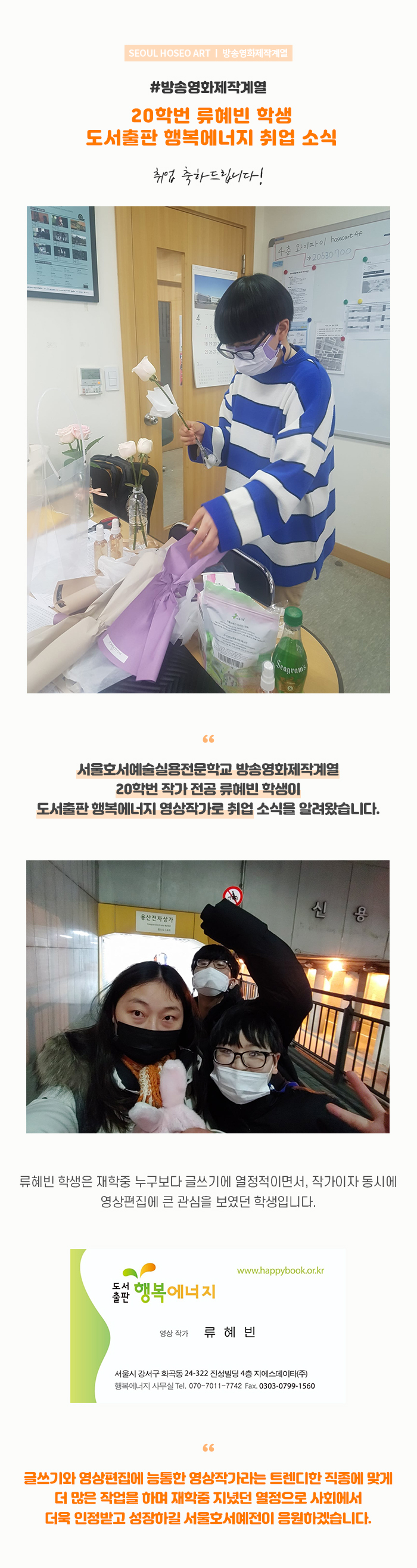서울호서예술실용전문학교 방송영화제작계열 20학번 작가 전공 류혜빈 학생이 도서출판 행복에너지 영상작가로 취업 소식을 알려왔습니다. 류혜빈 학생은 재학중 누구보다 글쓰기에 열정적이면서, 작가이자 동시에 영상편집에 큰 관심을 보였던 학생입니다.