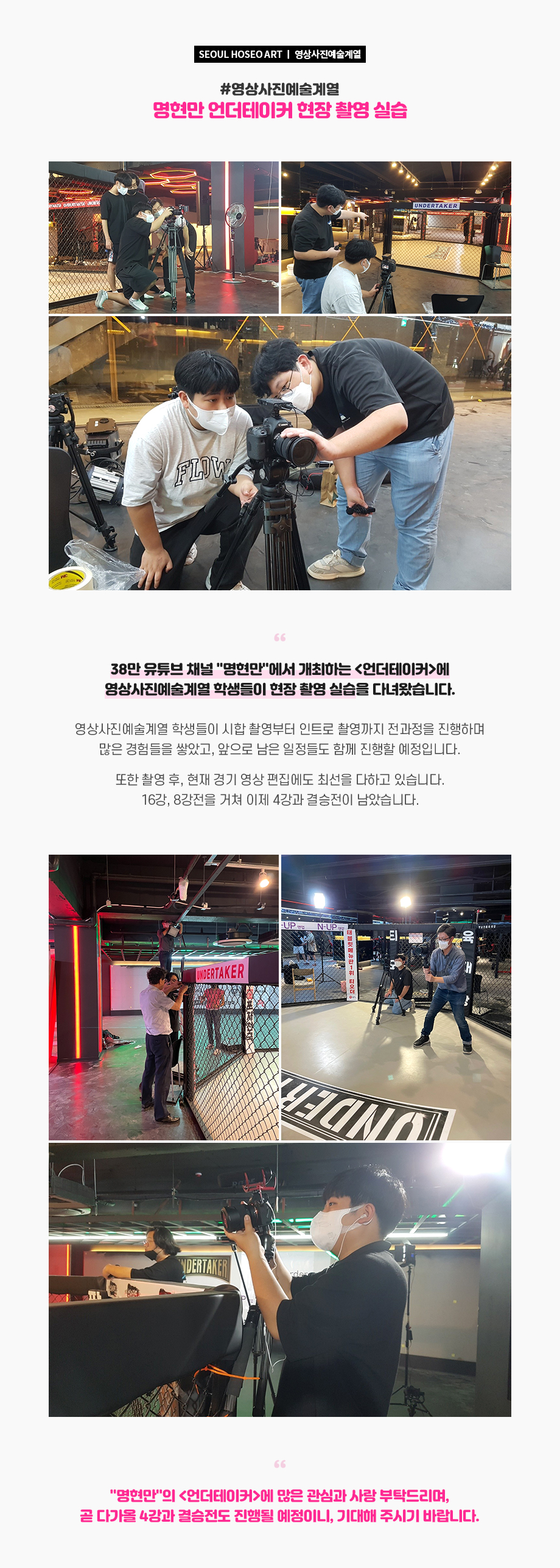 38만 유튜브 채널 "명현만"에서 개최하는 <언더테이커>에 영상사진예술계열 학생들이 현장 촬영 실습을 다녀왔습니다. 영상사진예술계열 학생들이 시합 촬영부터 인트로 촬영까지 전과정을 진행하며 많은 경험들을 쌓았고, 앞으로 남은 일정들도 함께 진행할 예정입니다.