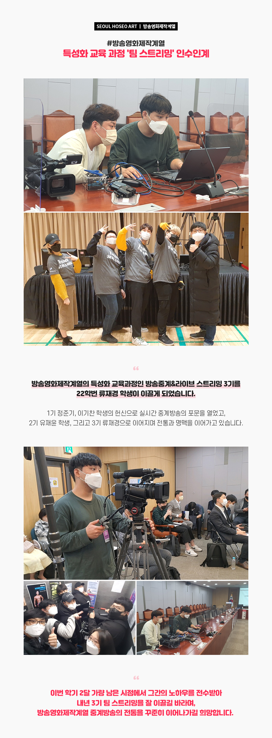 방송영화제작계열의 특성화 교육과정인 방송중계&라이브 스트리밍 3기를 22학번 류재경 학생이 이끌게 되었습니다. 1기 정준기, 이기찬 학생의 헌신으로 실시간 중계방송의 포문을 열었고, 2기 유재윤 학생, 그리고 3기 류재경으로 이어지며 전통과 명맥을 이어가고 있습니다.