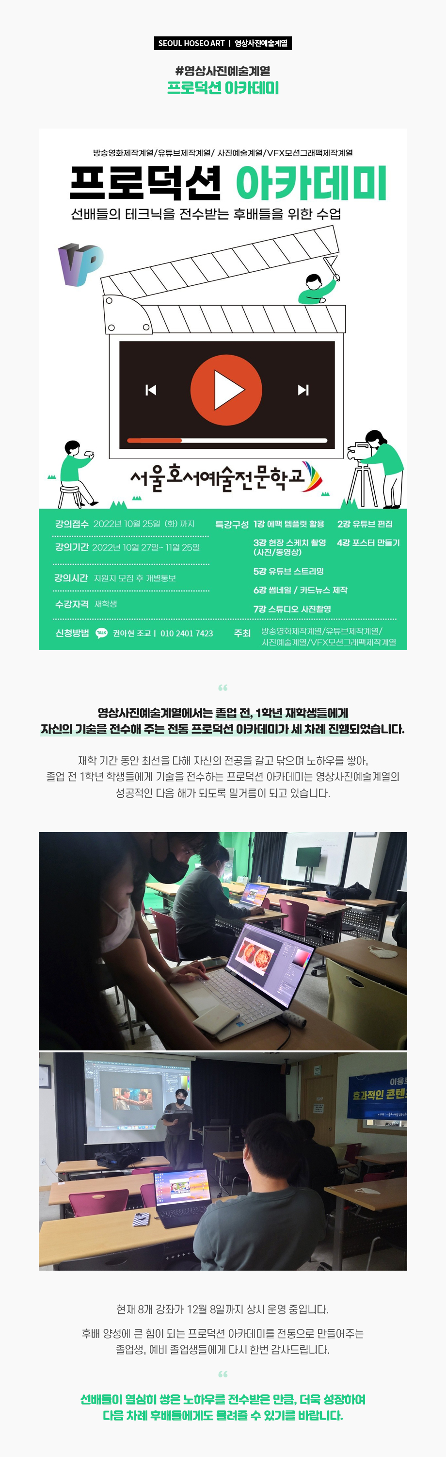 영상사진예술계열에서는 졸업 전, 1학년 재학생들에게 자신의 기술을 전수해 주는 전통 프로덕션 아카데미가 세 차례 진행되었습니다. 재학 기간 동안 최선을 다해 자신의 전공을 갈고 닦으며 노하우를 쌓아, 졸업 전 1학년 학생들에게 기술을 전수하는 프로덕션 아카데미는 영상사진예술계열의 성공적인 다음 해가 되도록 밑거름이 되고 있습니다.