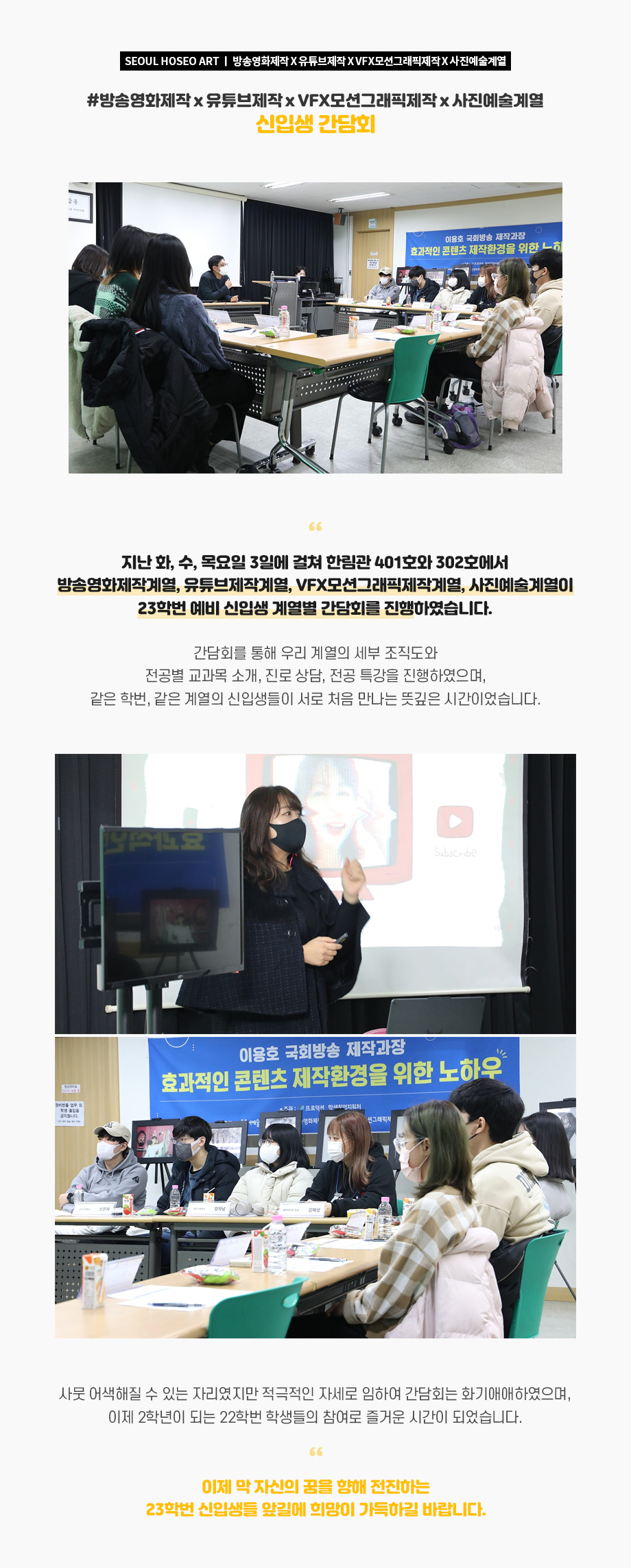 지난 화, 수, 목요일 3일에 걸쳐 한림관 401호와 302호에서 방송영화제작계열, 유튜브제작계열, VFX모션그래픽제작계열, 사진예술계열이 23학번 예비 신입생 계열별 간담회를 진행하였습니다. 간담회를 통해 우리 계열의 세부 조직도와 전공별 교과목 소개, 진로 상담, 전공 특강을 진행하였으며, 같은 학번, 같은 계열의 신입생들이 서로 처음 만나는 뜻깊은 시간이었습니다.