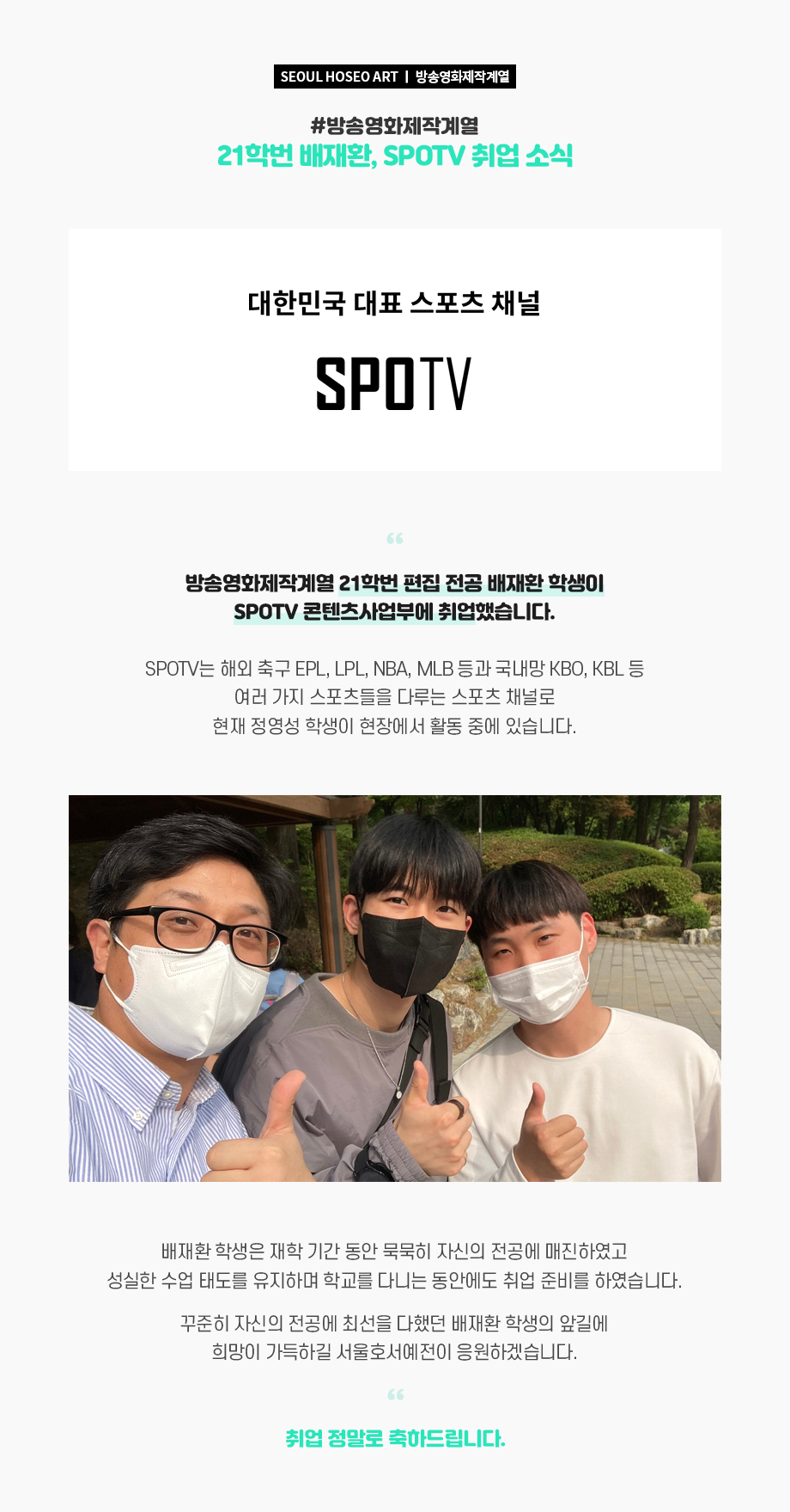 서울호서예술실용전문학교 방송영화제작계열 21학번 편집 전공 배재환 학생이 SPOTV 콘텐츠사업부에 취업했습니다. SPOTV는 해외 축구 EPL, LPL, NBA, MLB 등과 국내망 KBO, KBL 등 여러 가지 스포츠들을 다루는 스포츠 채널로 현재 정영성 학생이 현장에서 활동 중에 있습니다.
