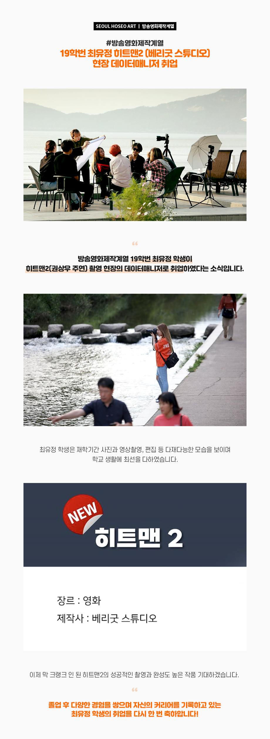 방송영화제작계열 19학번 최유정 학생이 히트맨2(권상우 주연) 촬영 현장의 데이터매니저로 취업하였다는 소식입니다. 최유정 학생은 재학기간 사진과 영상촬영, 편집 등 다재다능한 모습을 보이며 학교 생활에 최선을 다하였습니다.