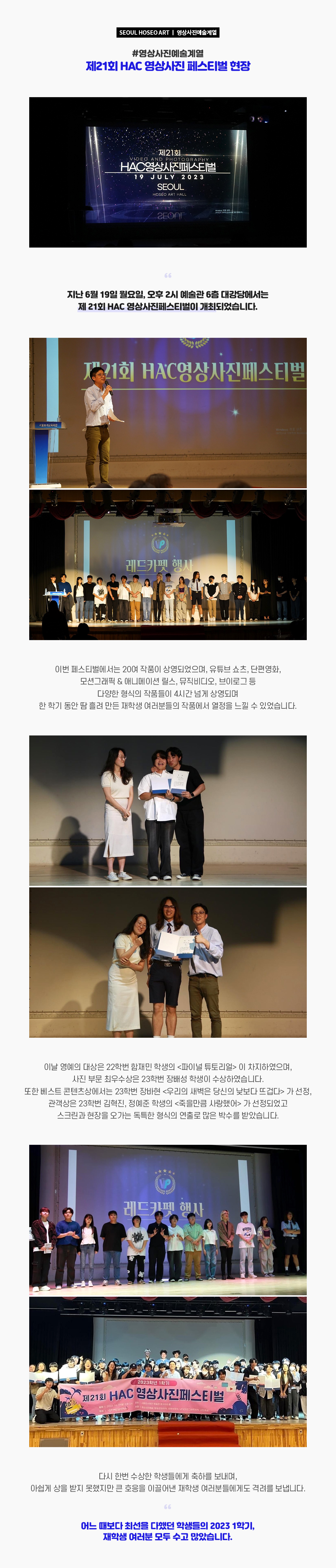 지난 6월 19일 월요일, 오후 2시 예술관 6층 대강당에서는 제 21회 HAC 영상사진페스티벌이 개최되었습니다. 이번 페스티벌에서는 20여 작품이 상영되었으며, 유튜브 쇼츠, 단편영화, 모션그래픽 & 애니메이션 릴스, 뮤직비디오, 브이로그 등 다양한 형식의 작품들이 4시간 넘게 상영되며 한 학기 동안 땀 흘려 만든 재학생 여러분들의 작품에서 열정을 느낄 수 있었습니다