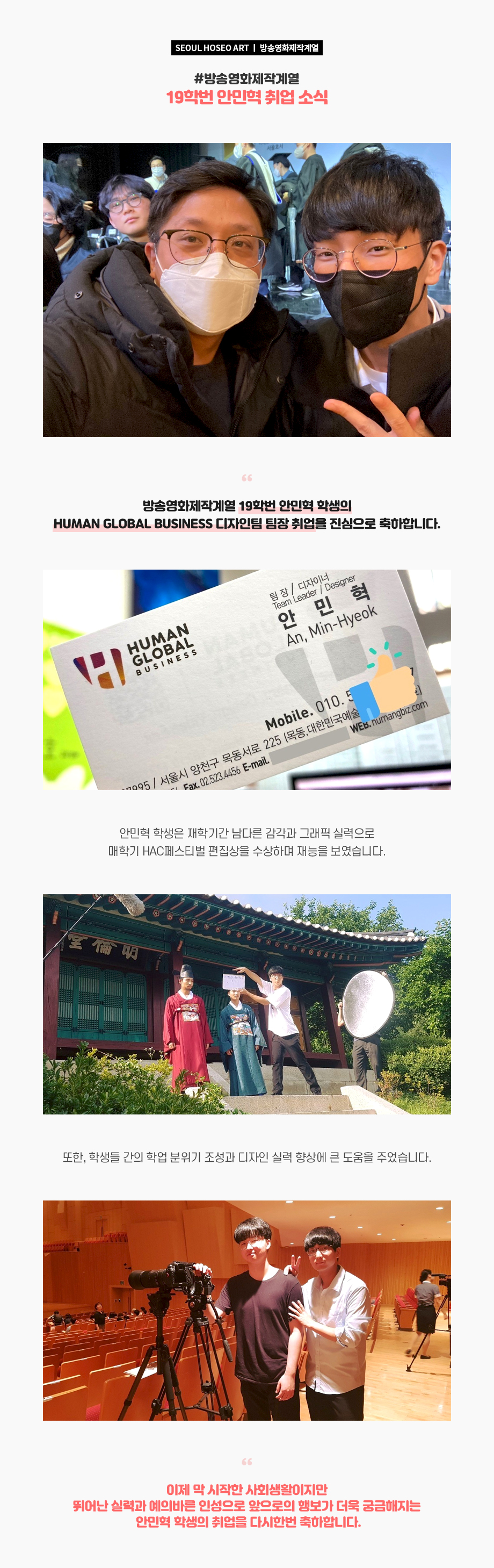 방송영화제작계열 19학번 안민혁 학생의 HUMAN GLOBAL BUSINESS 디자인팀 팀장 취업을 진심으로 축하합니다. 안민혁 학생은 재학기간 남다른 감각과 그래픽 실력으로 매학기 HAC페스티벌 편집상을 수상하며 재능을 보였습니다.