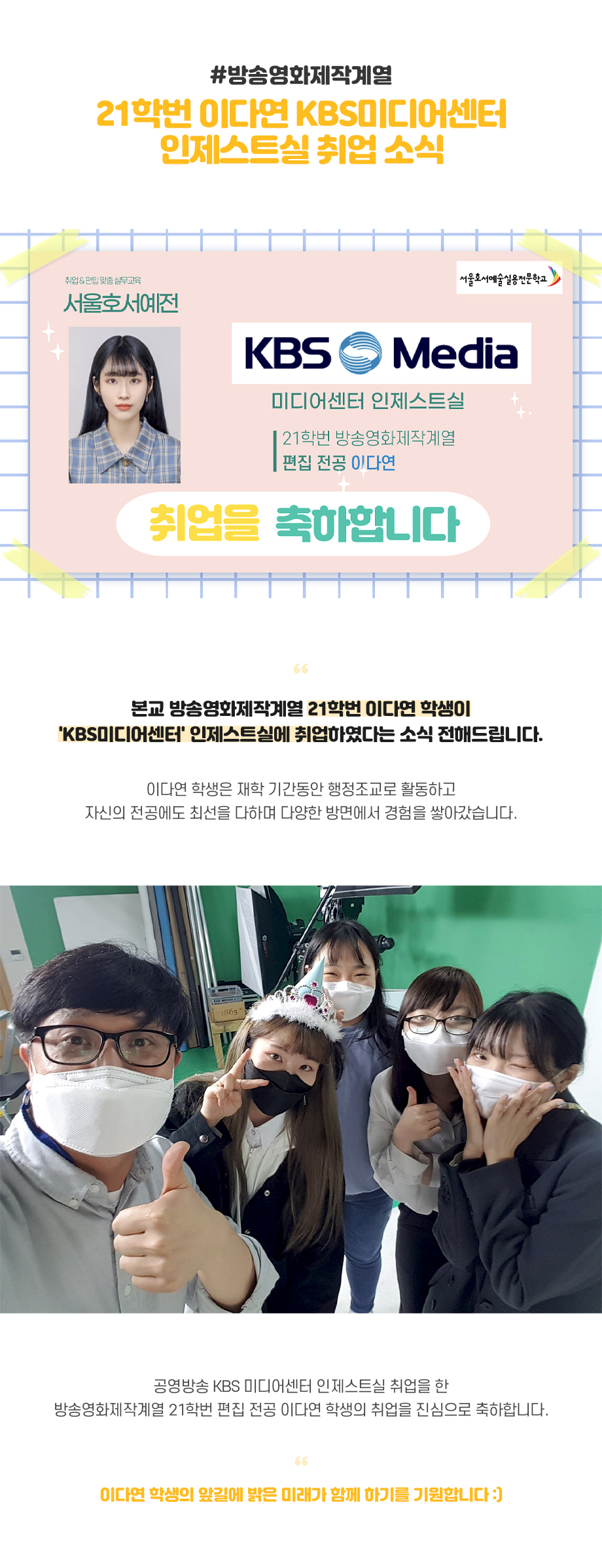 방송영화제작계열 21학번 이다연 KBS미디어센터 인제스트실 취업 소식