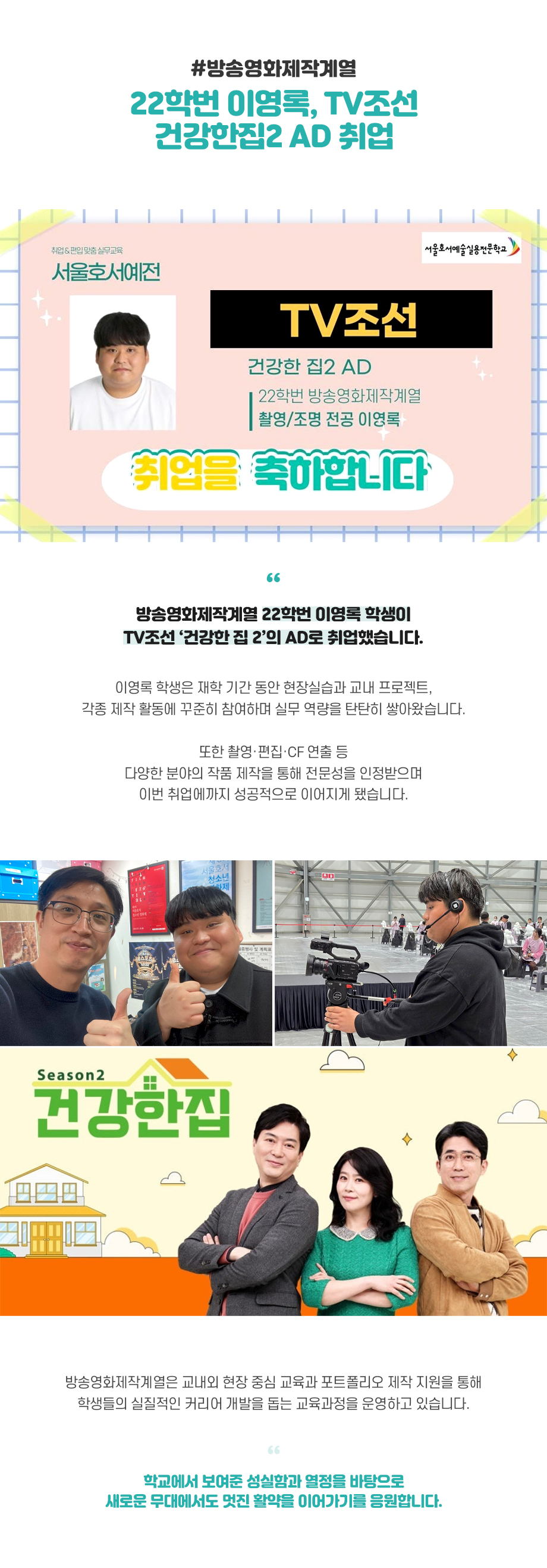 방송영화제작계열 22학번 이영록 학생이 TV조선 ‘건강한 집 2’의 AD로 취업했습니다. 이영록 학생은 재학 기간 동안 현장실습과 교내 프로젝트, 각종 제작 활동에 꾸준히 참여하며 실무 역량을 탄탄히 쌓아왔습니다.