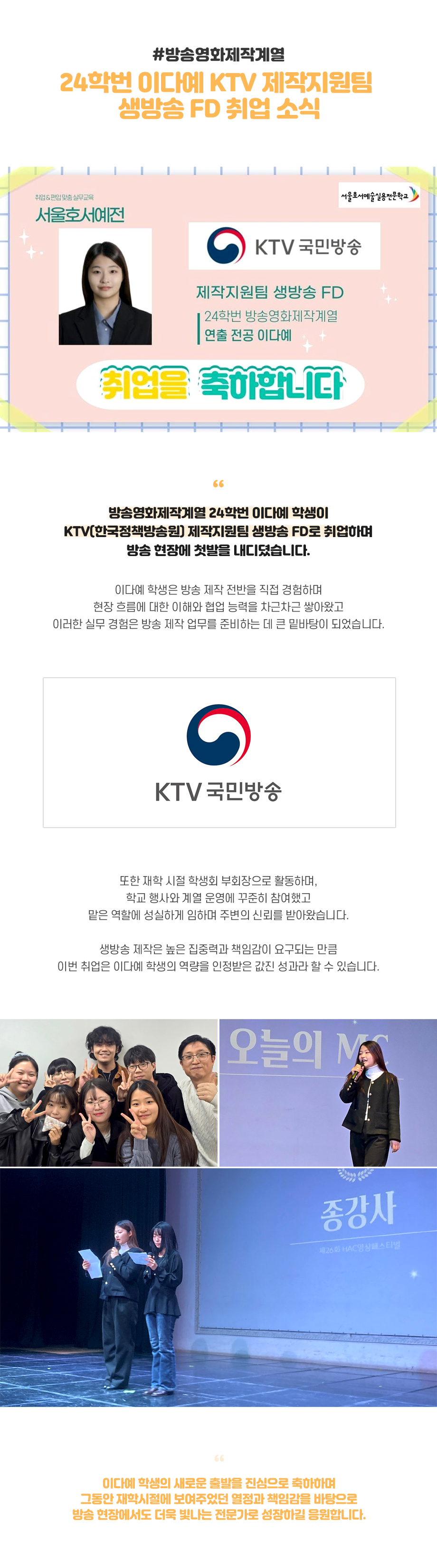 방송영화제작계열 24학번 이다예 학생이 KTV(한국정책방송원) 제작지원팀 생방송 FD로 취업하며 방송 현장에 첫발을 내디뎠습니다.