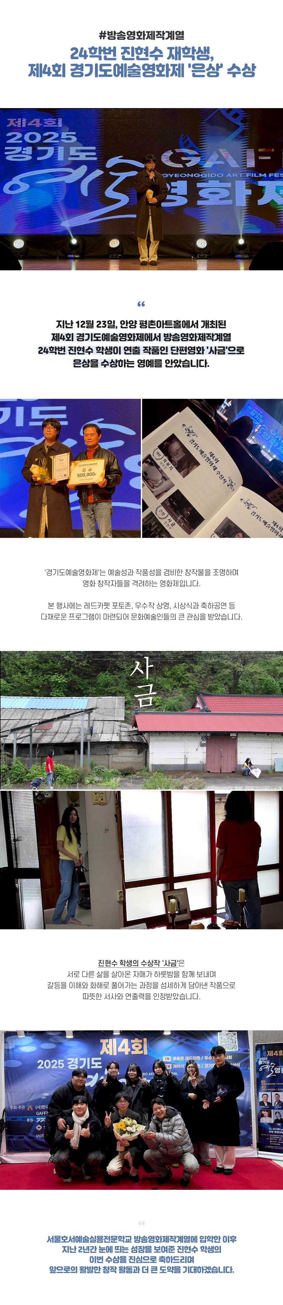 지난 12월 23일, 안양 평촌아트홀에서 개최된 제4회 경기도예술영화제(GAFF, Gyeonggido Art Film Festival)에서 방송영화제작계열 24학번 진현수 학생이 연출 작품인 단편영화 '사금'으로 은상을 수상하는 영예를 안았습니다.