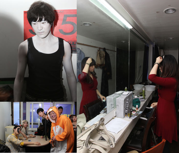 연극제가 시작하기에 앞서 분장을 하며 연기 연습을 하고 있는 학생들의 모습입니다.
