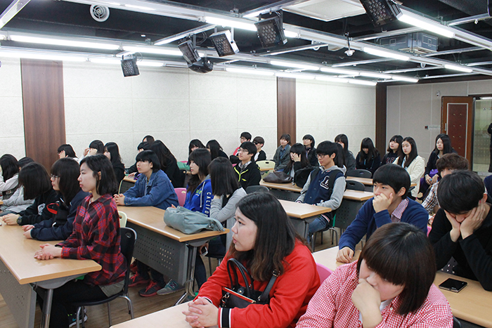 체험학교를 신청한 학생들이 모두 모여 앉아 열심히 듣고있어요~