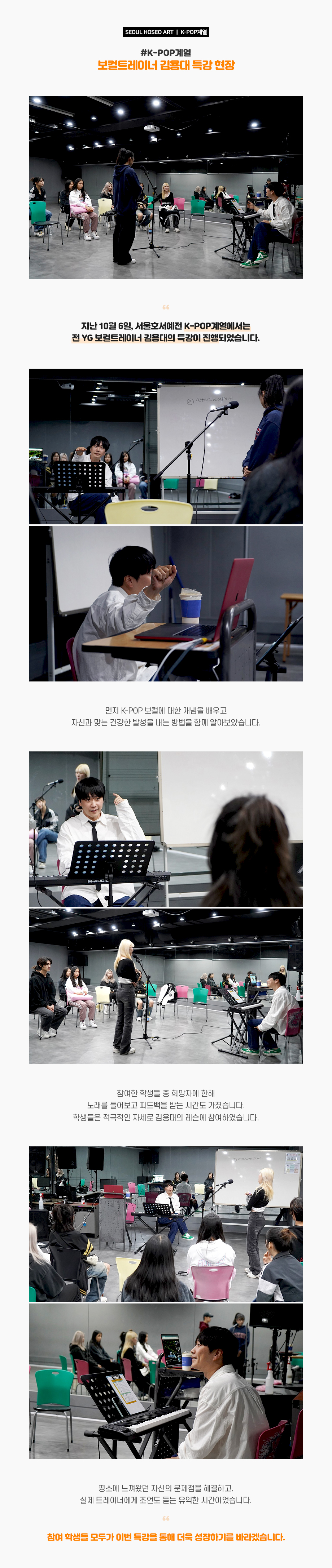 지난 10월 6일, 서울호서예전 K-POP계열에서는 전 YG 보컬트레이너 김용대의 특강이 진행되었습니다. 먼저 K-POP 보컬에 대한 개념을 배우고 자신과 맞는 건강한 발성을 내는 방법을 함께 알아보았습니다. 참여한 학생들 중 희망자에 한해 노래를 들어보고 피드백을 받는 시간도 가졌습니다. 학생들은 적극적인 자세로 김용대의 레슨에 참여하였습니다.