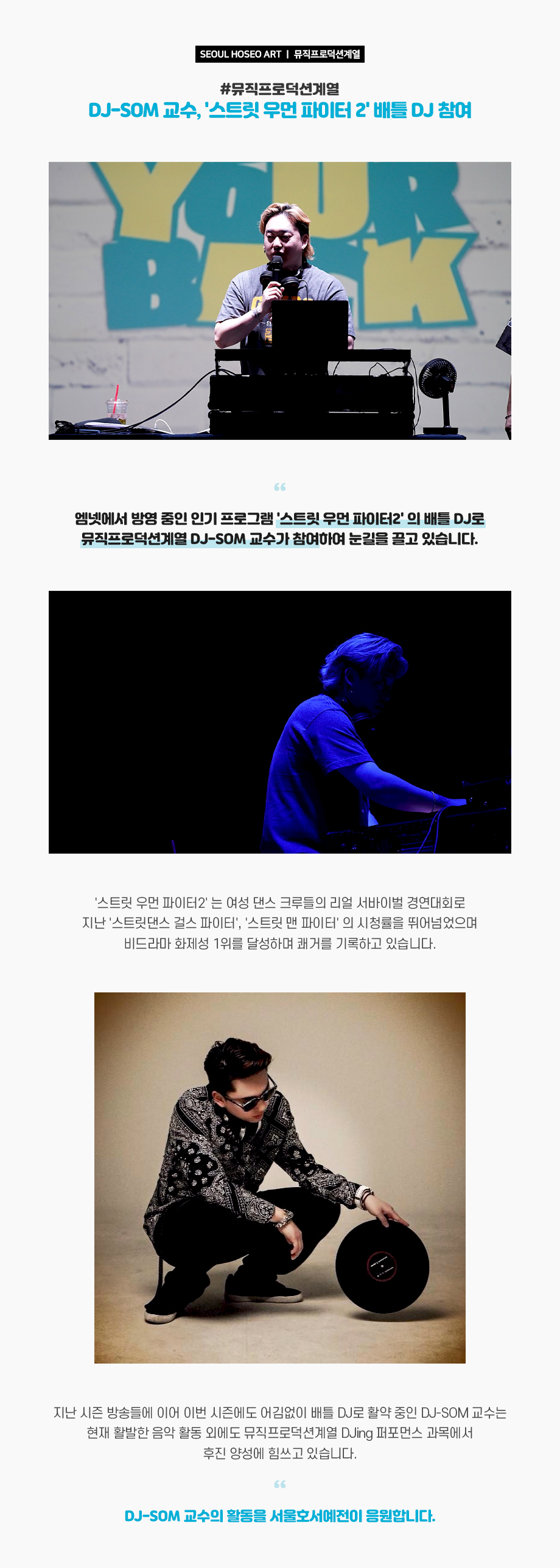 엠넷에서 방영 중인 인기 프로그램 '스트릿 우먼 파이터2' 의 배틀 DJ로 뮤직프로덕션계열 DJ-SOM 교수가 참여하여 눈길을 끌고 있습니다. '스트릿 우먼 파이터2' 는 여성 댄스 크루들의 리얼 서바이벌 경연대회로 지난 '스트릿댄스 걸스 파이터', '스트릿 맨 파이터' 의 시청률을 뛰어넘었으며 비드라마 화제성 1위를 달성하며 쾌거를 기록하고 있습니다.