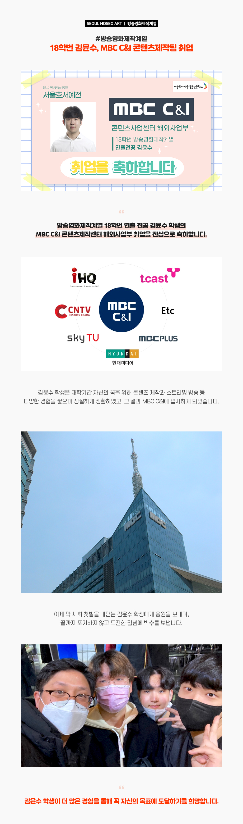 방송영화제작계열 18학번 연출 전공 김윤수 학생의 MBC C&I 콘텐츠제작센터 해외사업부 취업을 진심으로 축하합니다. 김윤수 학생은 재학기간 자신의 꿈을 위해 콘텐츠 제작과 스트리밍 방송 등 다양한 경험을 쌓으며 성실하게 생활하였고, 그 결과 MBC C&I에 입사하게 되었습니다.
