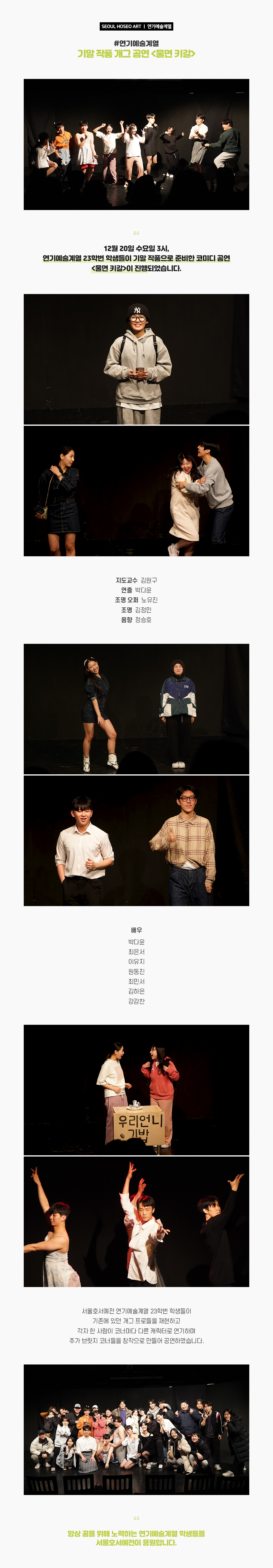12월 20일 수요일 3시, 연기예술계열 23학번 학생들이 기말 작품으로 준비한 코미디 공연 <울면 키갈>이 진행되었습니다. 서울호서예전 연기예술계열 23학번 학생들이 기존에 있던 개그 프로들을 재현하고 각자 한 사람이 코너마다 다른 캐릭터로 연기하며 추가 브릿지 코너들을 창작으로 만들어 공연하였습니다.