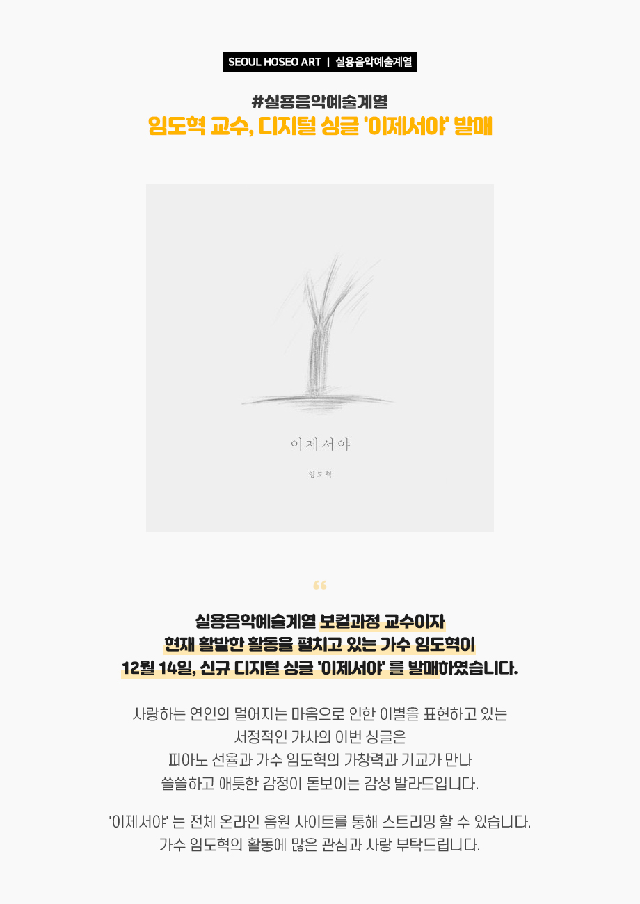 실용음악예술계열 보컬과정 교수이자 현재 활발한 활동을 펼치고 있는 가수 임도혁이 12월 14일, 신규 디지털 싱글 '이제서야' 를 발매하였습니다. 사랑하는 연인의 멀어지는 마음으로 인한 이별을 표현하고 있는 서정적인 가사의 이번 싱글은 피아노 선율과 가수 임도혁의 가창력과 기교가 만나 쓸쓸하고 애틋한 감정이 돋보이는 감성 발라드입니다.