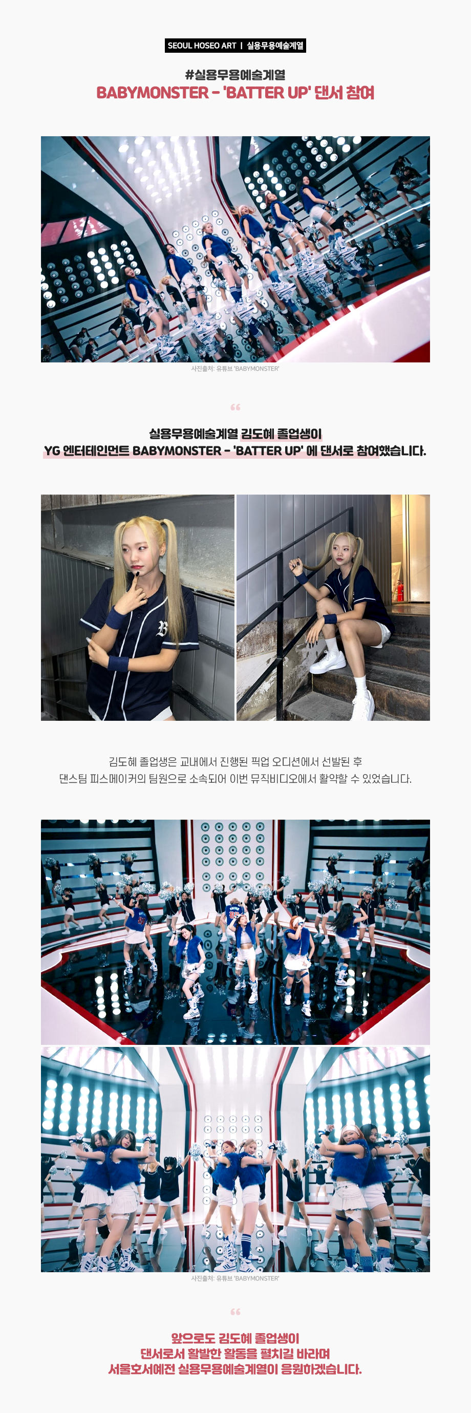 실용무용예술계열 김도혜 졸업생이 YG 엔터테인먼트 BABYMONSTER - 'BATTER UP' 에 댄서로 참여했습니다. 김도혜 졸업생은 교내에서 진행된 픽업 오디션에서 선발된 후 댄스팀 피스메이커의 팀원으로 소속되어 이번 뮤직비디오에서 활약할 수 있었습니다.