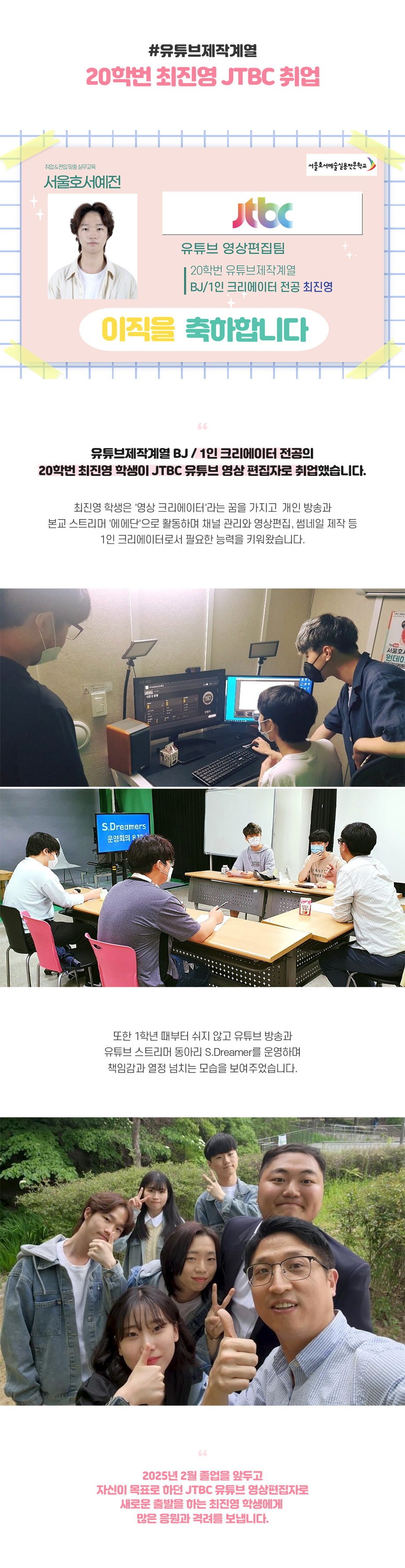 유튜브제작계열 BJ / 1인 크리에이터 전공의 20학번 최진영 학생이 JTBC 유튜브 영상 편집자로 취업했습니다. 최진영 학생은 '영상 크리에이터'라는 꿈을 가지고 개인 방송과 본교 스트리머 '에에단'으로 활동하며 채널 관리와 영상편집, 썸네일 제작 등 1인 크리에이터로서 필요한 능력을 키워왔습니다.