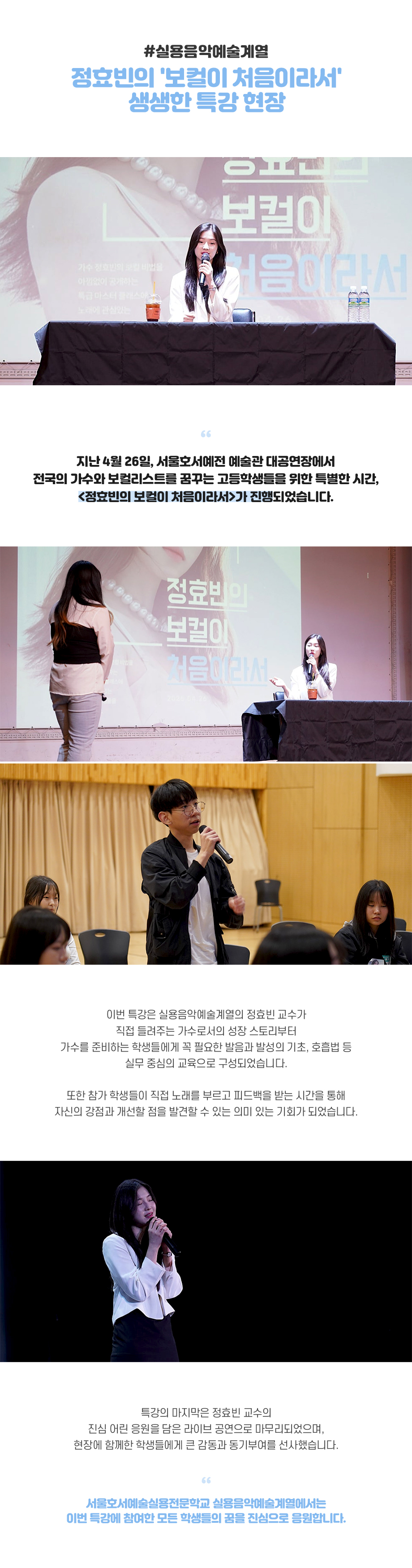 지난 4월 26일, 서울호서예술실용전문학교 예술관 대공연장에서 전국의 가수와 보컬리스트를 꿈꾸는 고등학생들을 위한 특별한 시간, <정효빈의 보컬이 처음이라서>가 진행되었습니다. 이번 특강은 실용음악예술계열의 정효빈 교수가 직접 들려주는 가수로서의 성장 스토리부터 가수를 준비하는 학생들에게 꼭 필요한 발음과 발성의 기초, 호흡법 등 실무 중심의 교육으로 구성되었습니다.